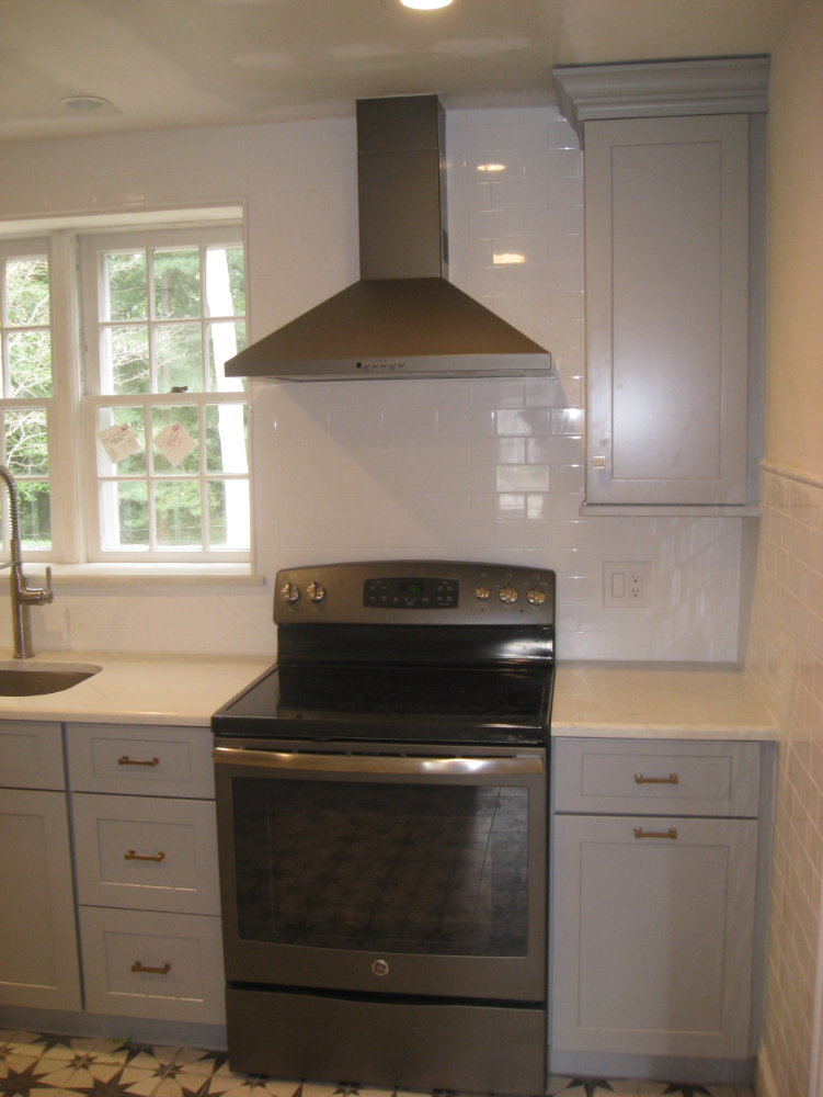 Kitchen renovation Haddonfield, NJ which involved gutting of old, including ceiling and walls and flooring for re-design of existing kitchen. Forevermark shaker style cabinetry with quartz countertops with stainless steel under mount sink. Subway style wall splash to ceiling and cabinet bases. New tile flooring and new hi hat led lighting.
