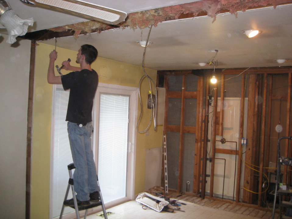 Removal of adjoining dining room wall to expand. Add LED hi hat lights and additional two pennant lights above new island cabinetry. Use Forevermark shaker style solid wood cabinetry. Granite tops with stainless steel under mount sink. New tile above granite counters to base of cabinets. New island work station with seating because of granite overhang on island.